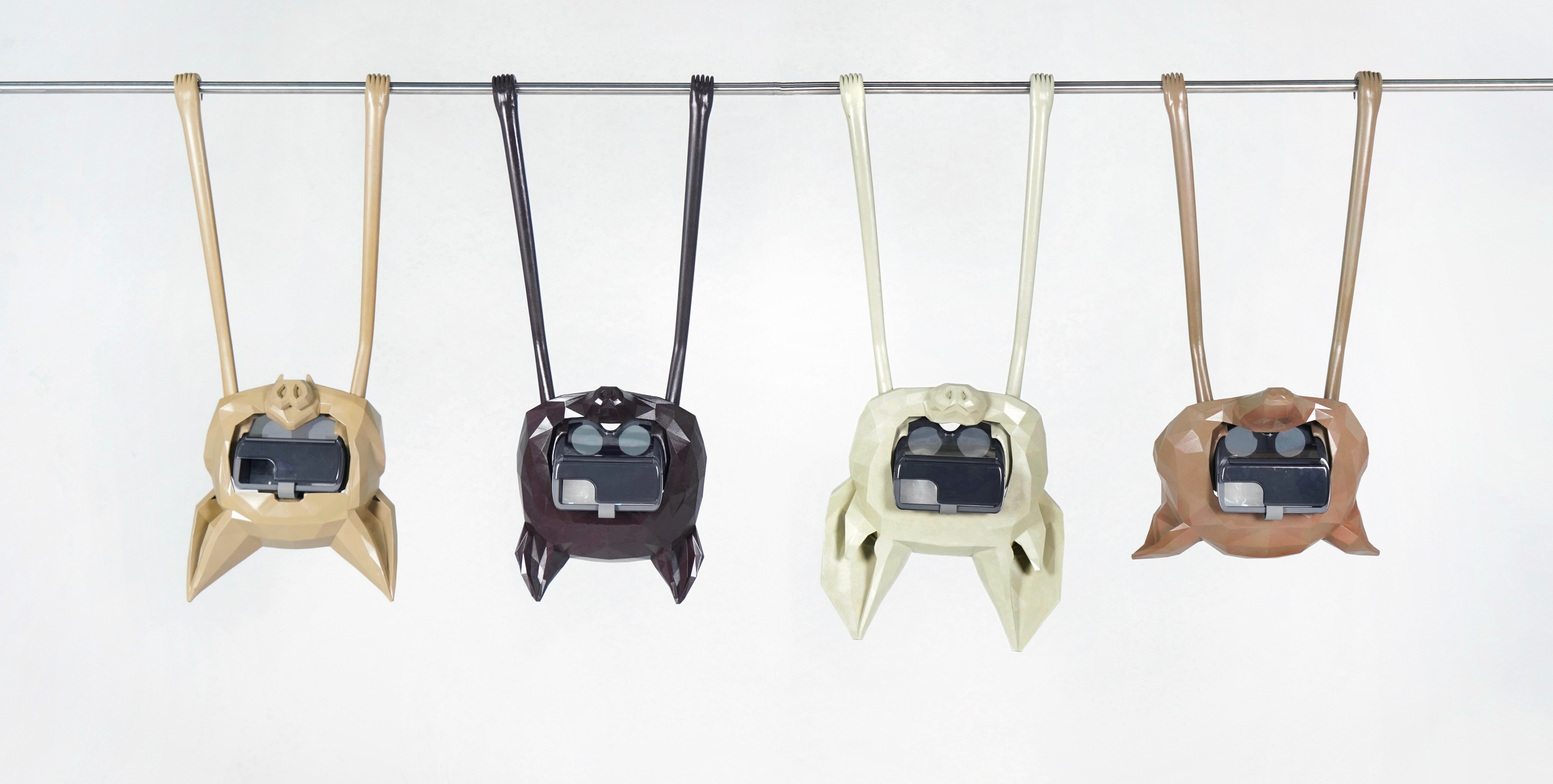 The handles provide an ergonomic way for users to hold the entire mask, preventing discomfort from headset weight and enabling easy passing to the next user. These detachable handles not only facilitate easy storage and replacement but also offer intuitive affordances for audience interaction and manipulation.