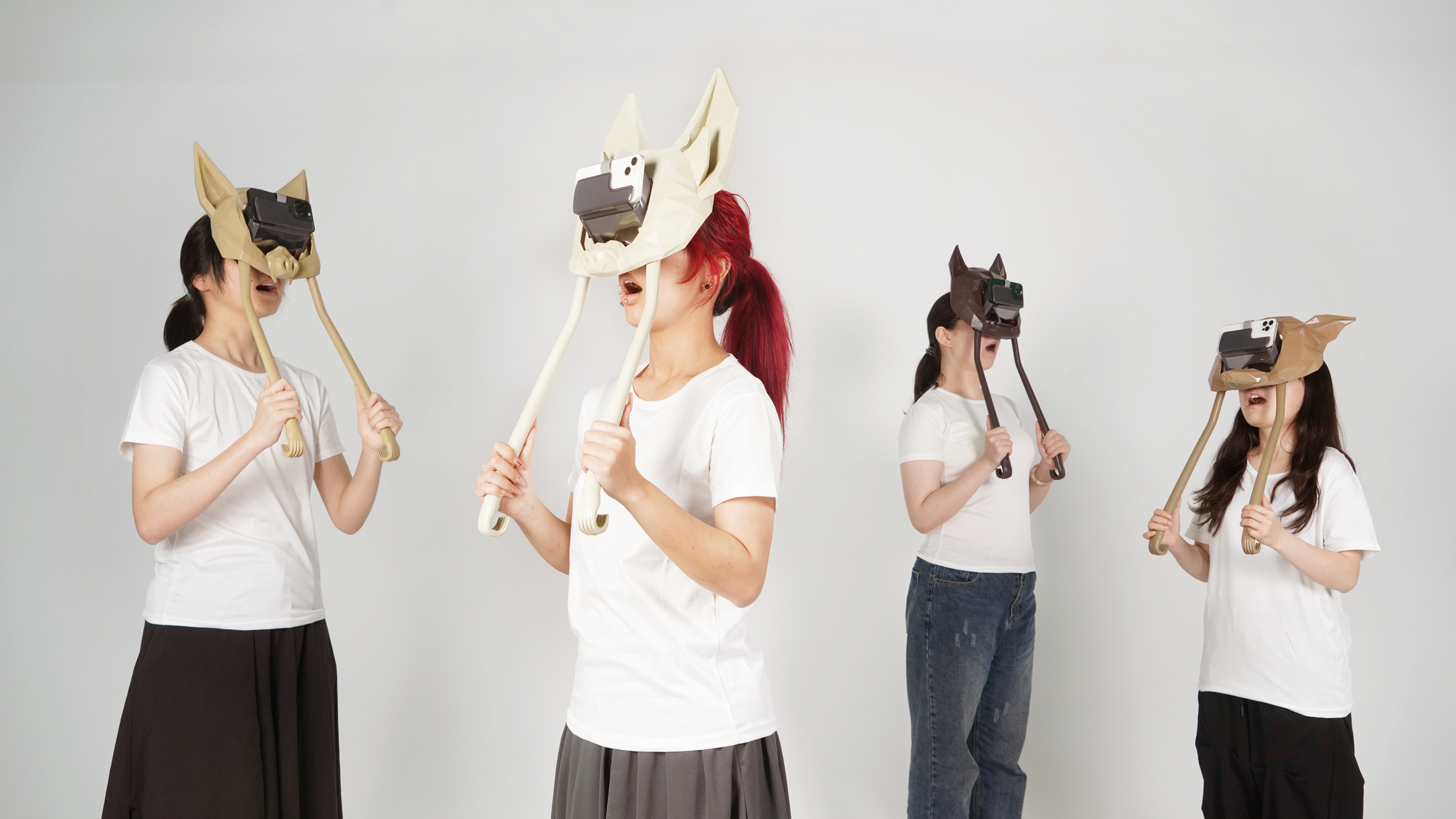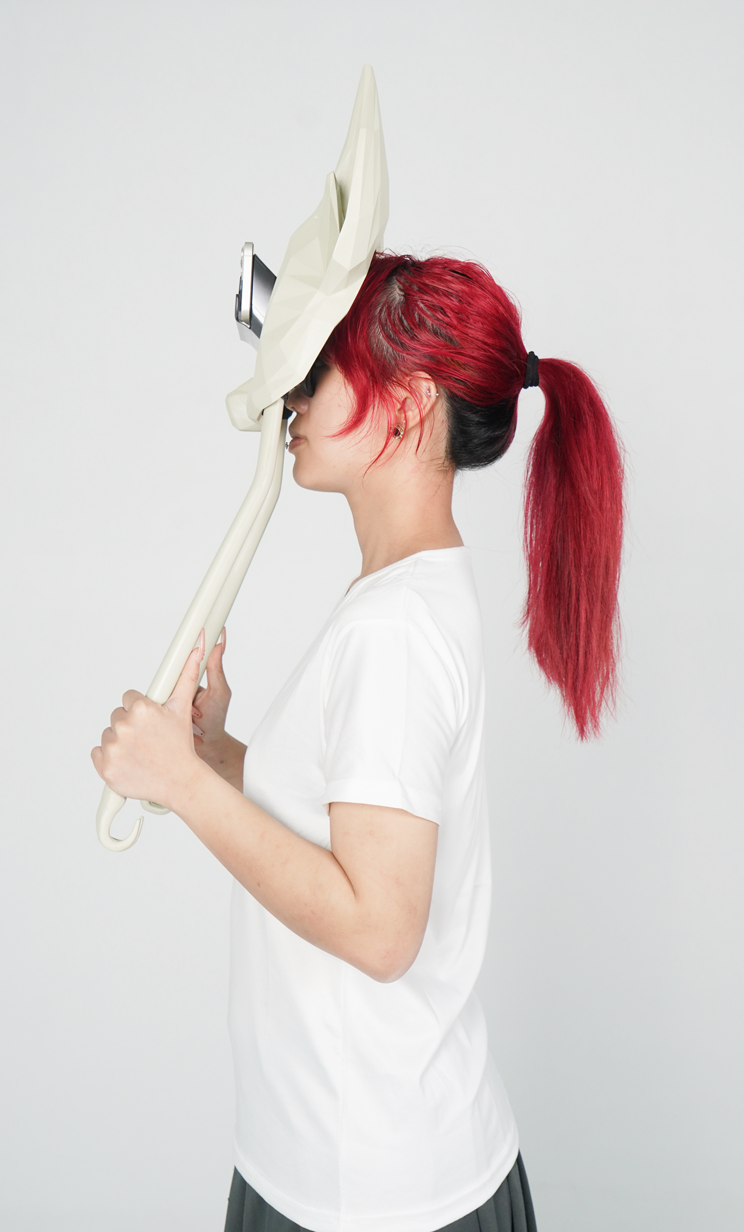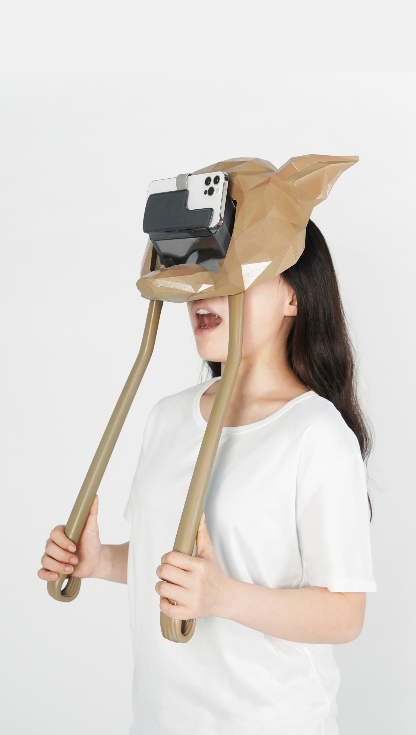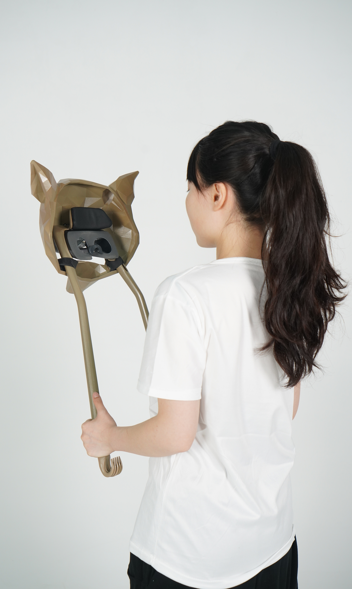 The handles provide an ergonomic way for users to hold the entire mask, preventing discomfort from headset weight and enabling easy passing to the next user. These detachable handles not only facilitate easy storage and replacement but also offer intuitive affordances for audience interaction and manipulation.